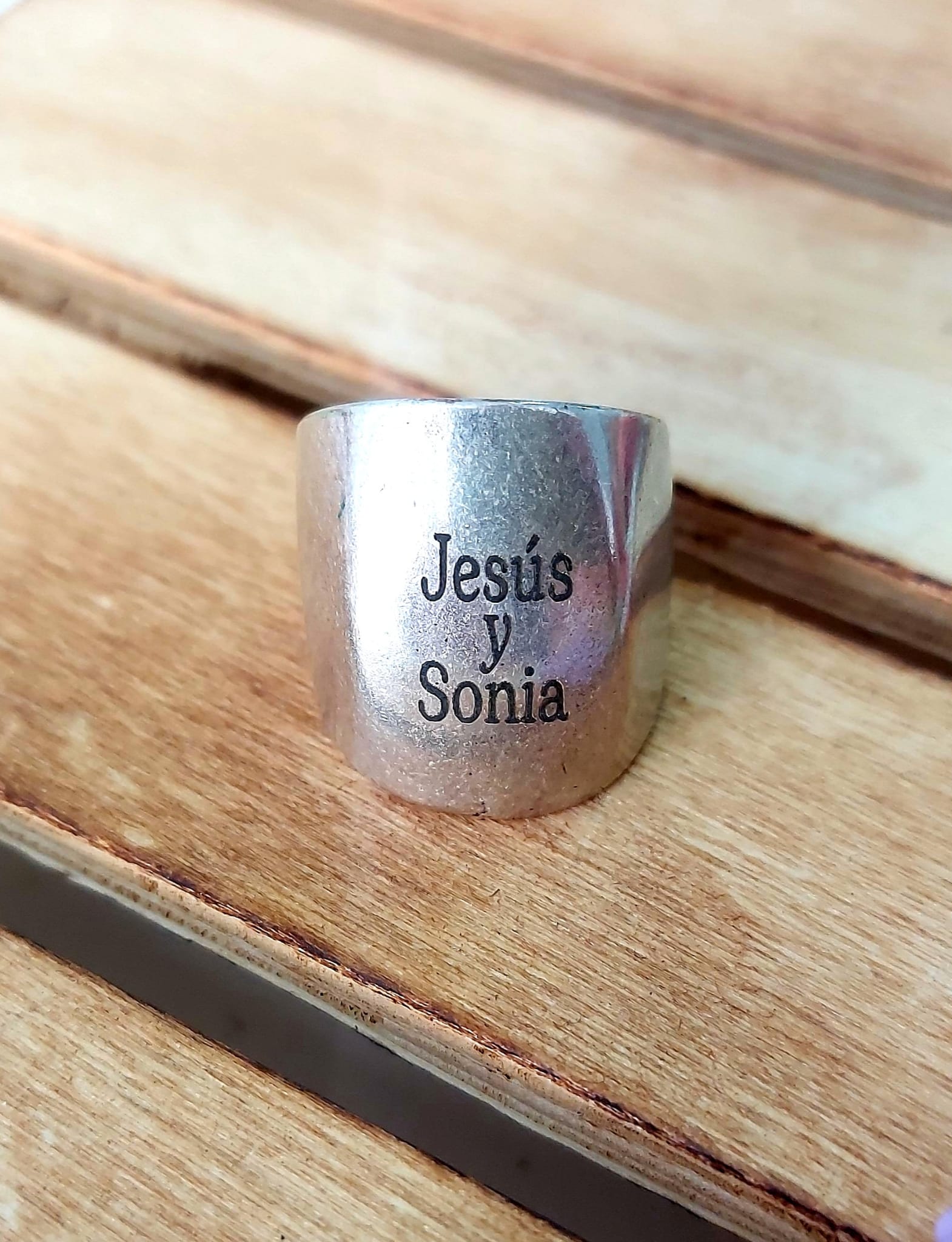 En texto dinos los nombres a grabar, texto o foto de la caja. y color del cuero.