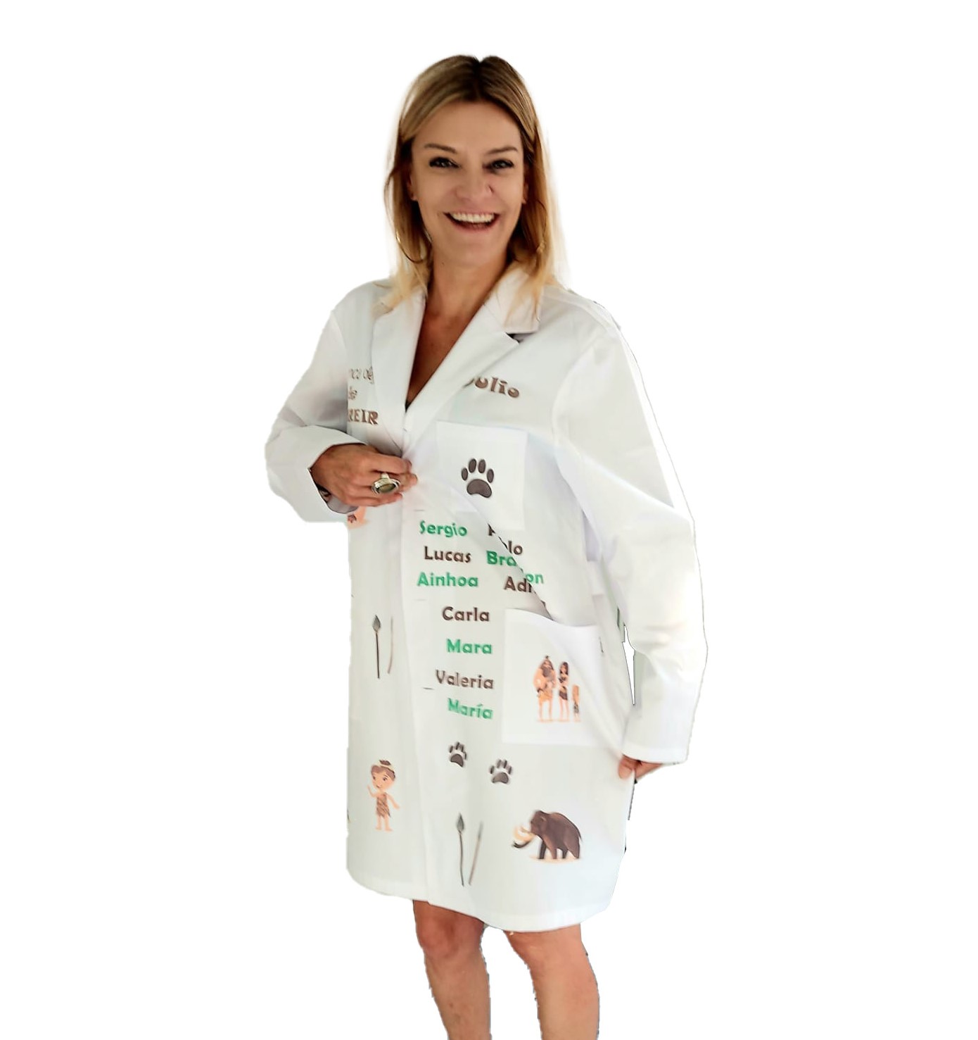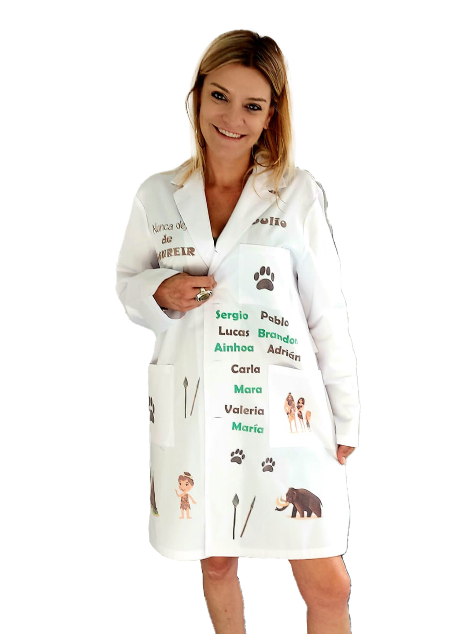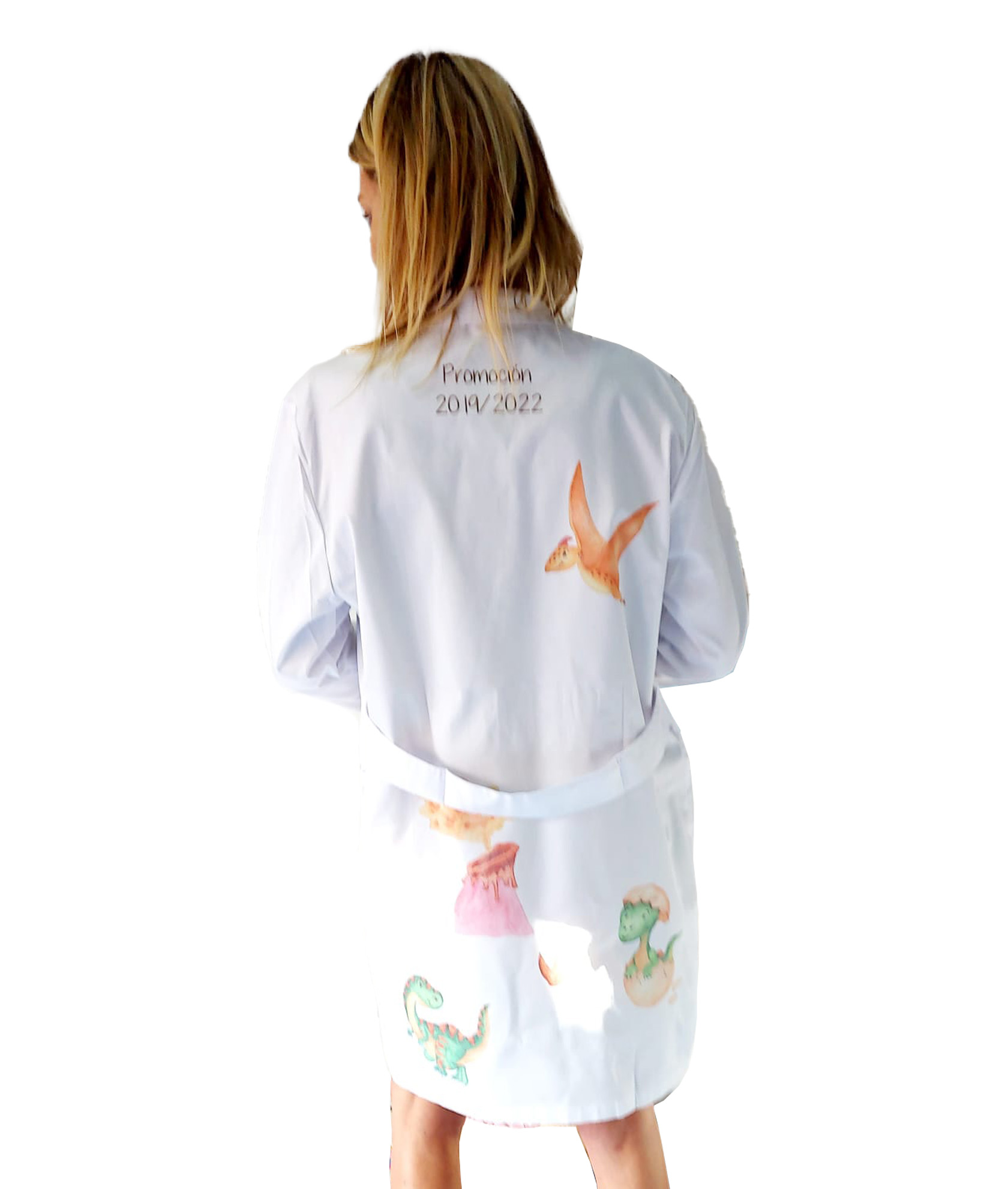Bata con botones, diseño dinosaurios, con el nombre de los alumnos, frase, curso , etc..