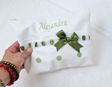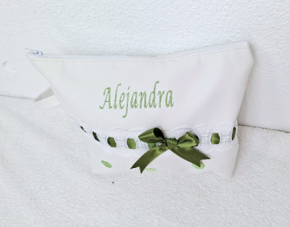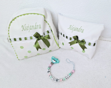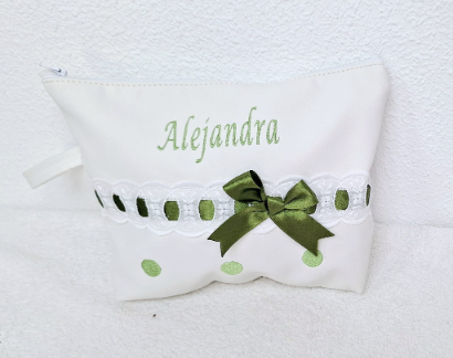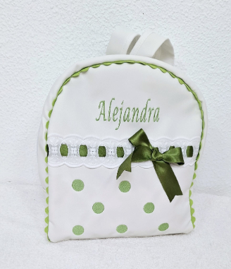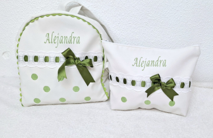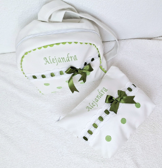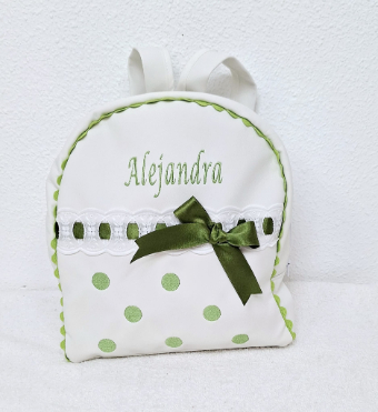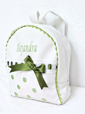 Mochila polipiel color blanca bordada topitos con lazo y borde de color a elegir. Con neceser a juego