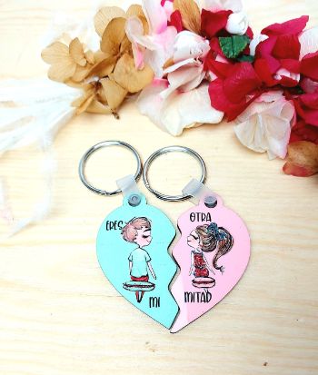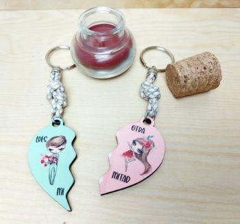Conjunto de dos llaveros de madera en forma de corazón partido.