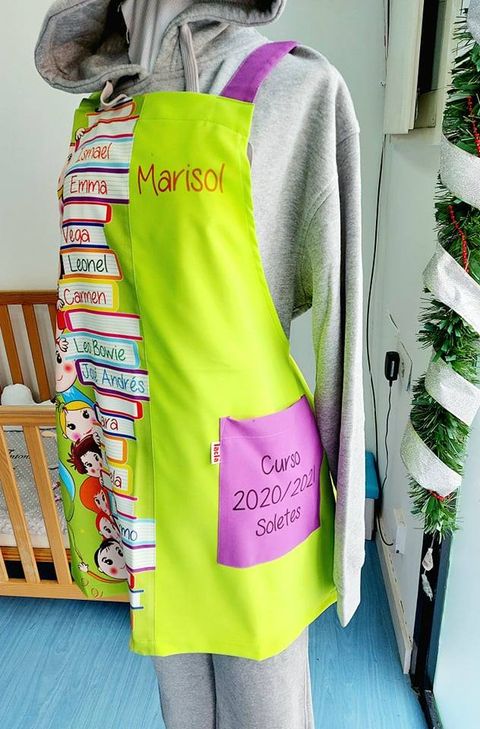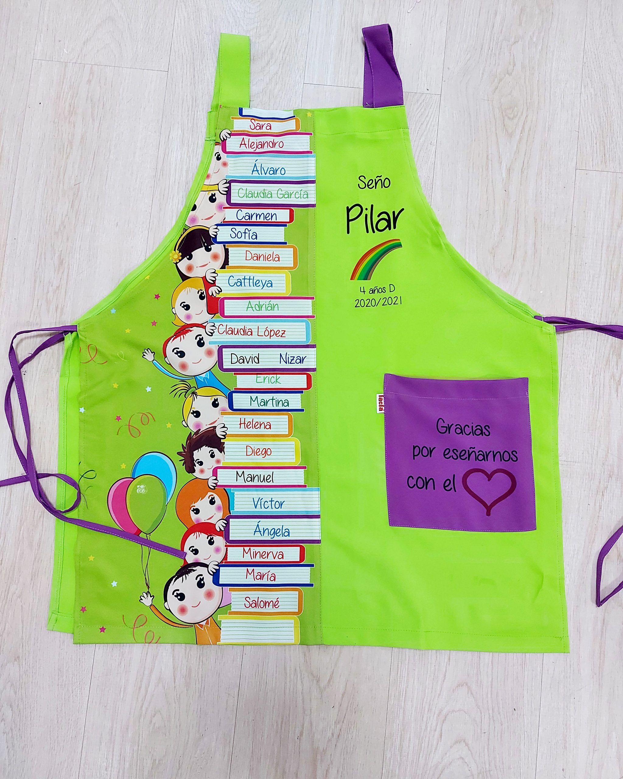 Con el nombe de los alumnos, frase que el quieras dedicar en el bolsillo y nombre de la seño, curso y demás.
