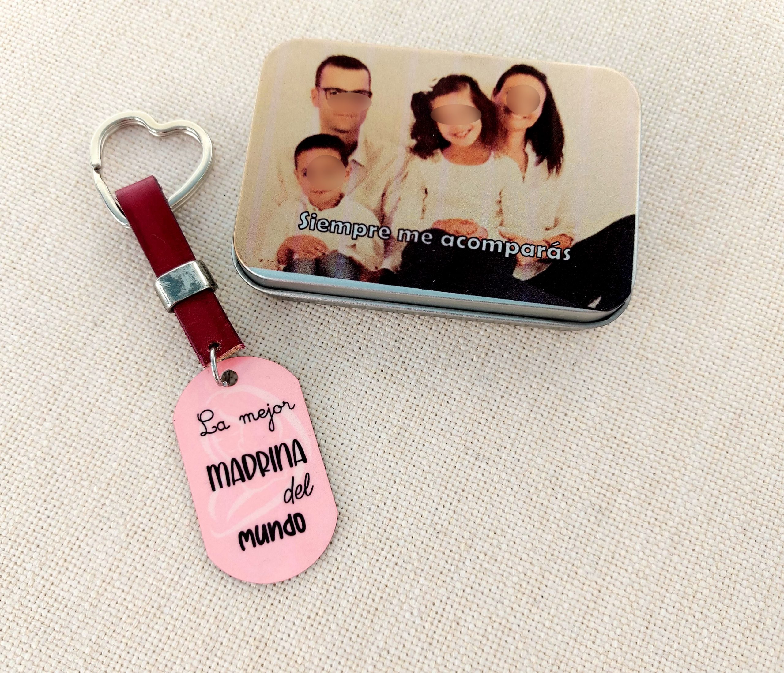 Llavero de aluminio con cuero naciona de alta calidad. En cajita de metal con foto