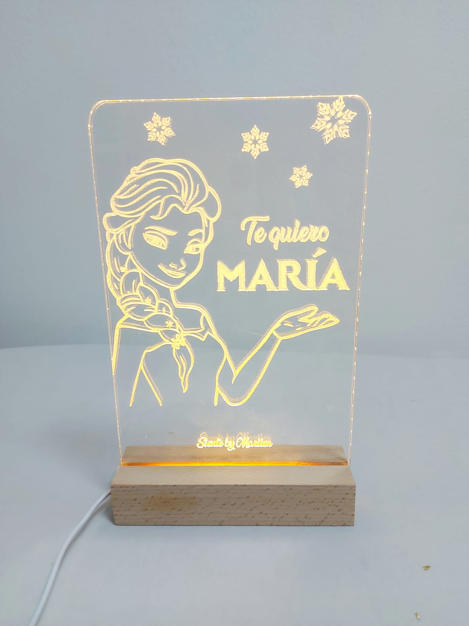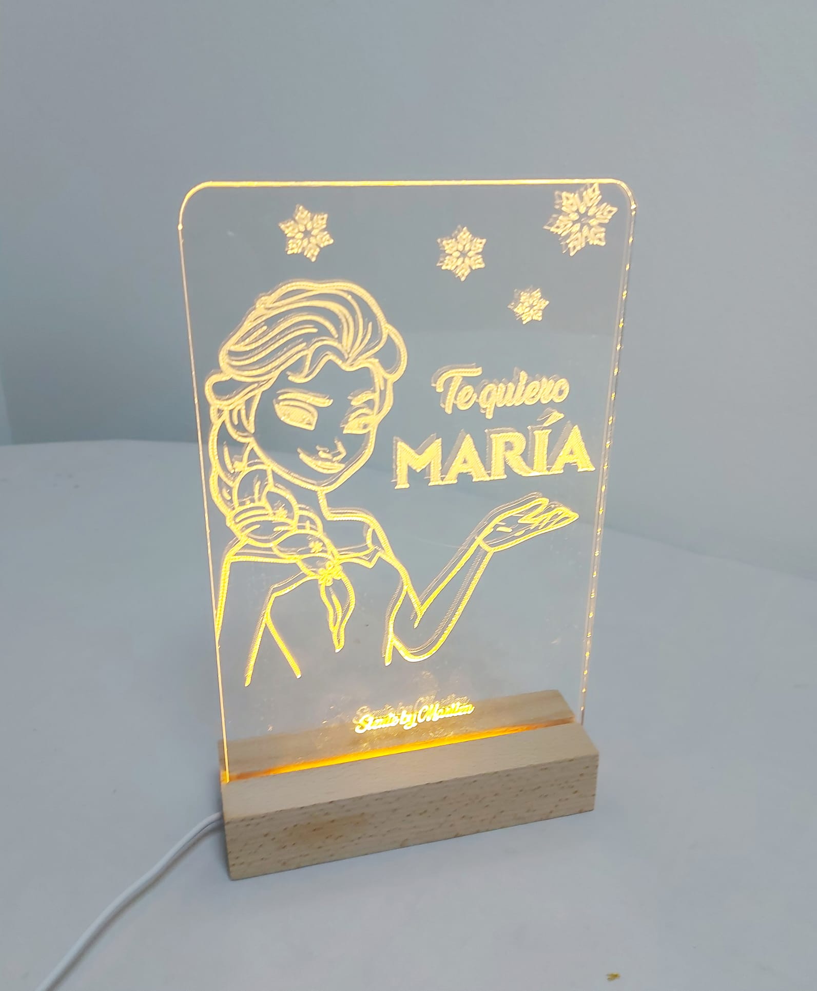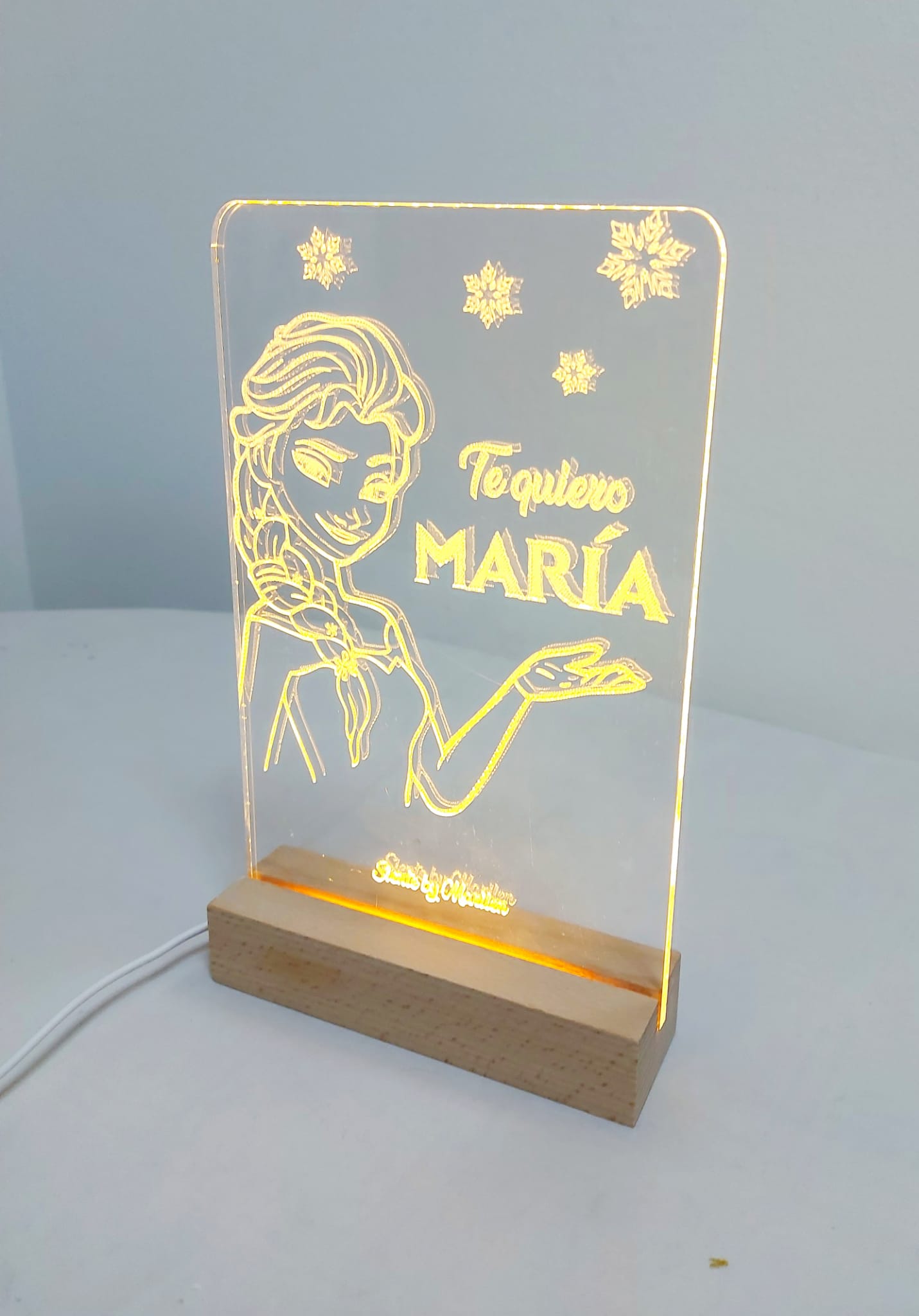 Lámpara de metacrilato con base de madera y luz Led.