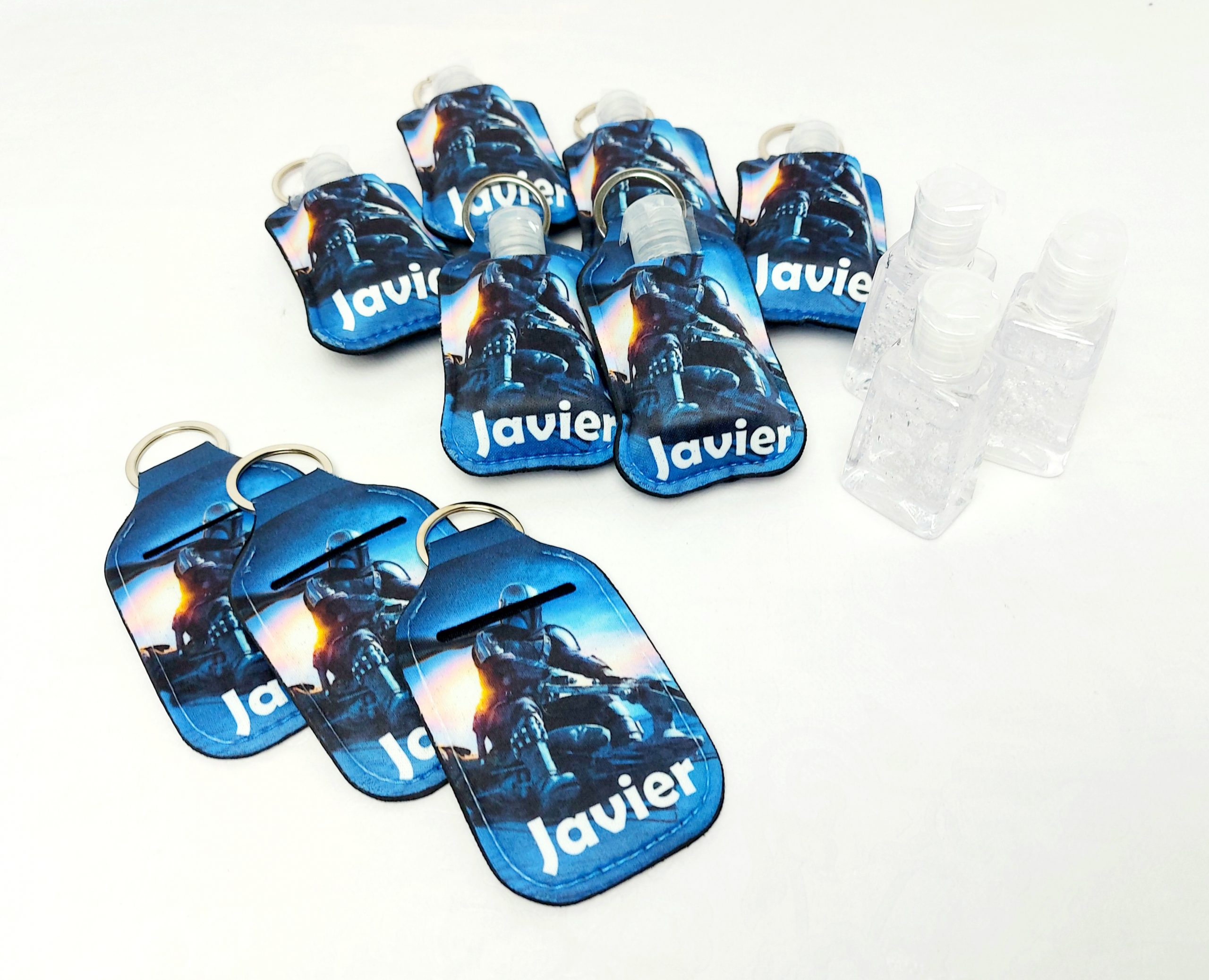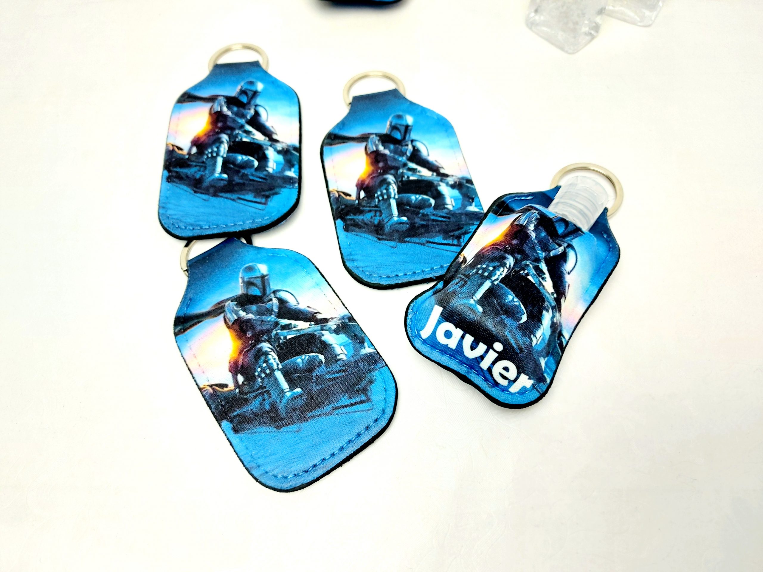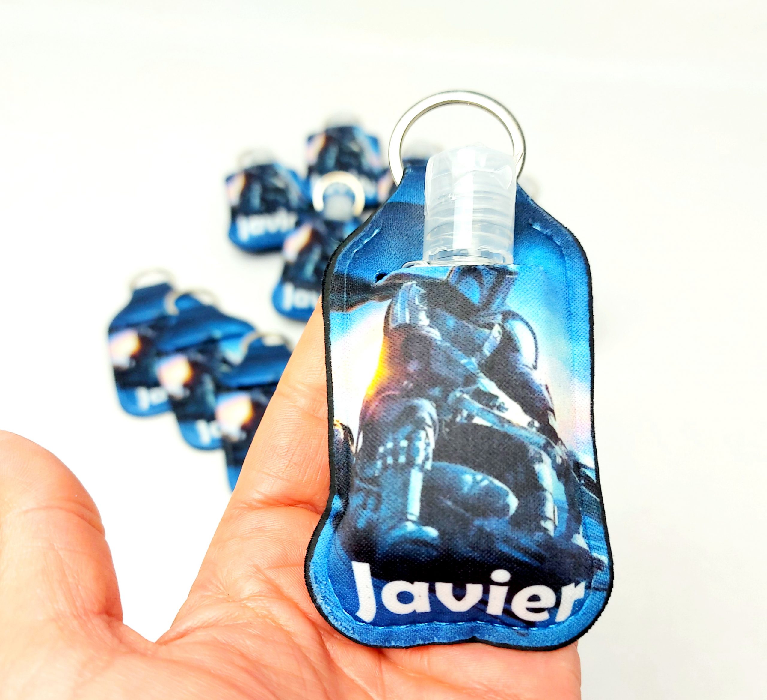 Llavero portabotellas para gel hidroalcohólico. Personalizado a dos caras en exclusiva para ti. con tu foto, texto y diseño preferido. Te hacemos diseño personalizado a tu gusto. Nombre de cada invitado, texto y diseño a elegir, etc…