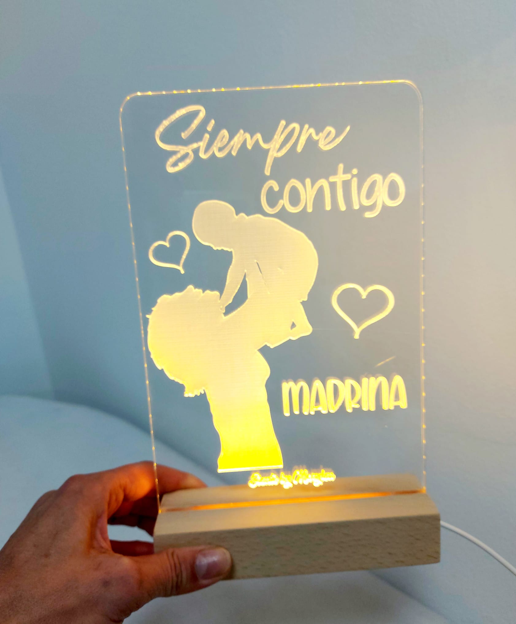 Lámpara de metracrilato con base de madera y luz Led.