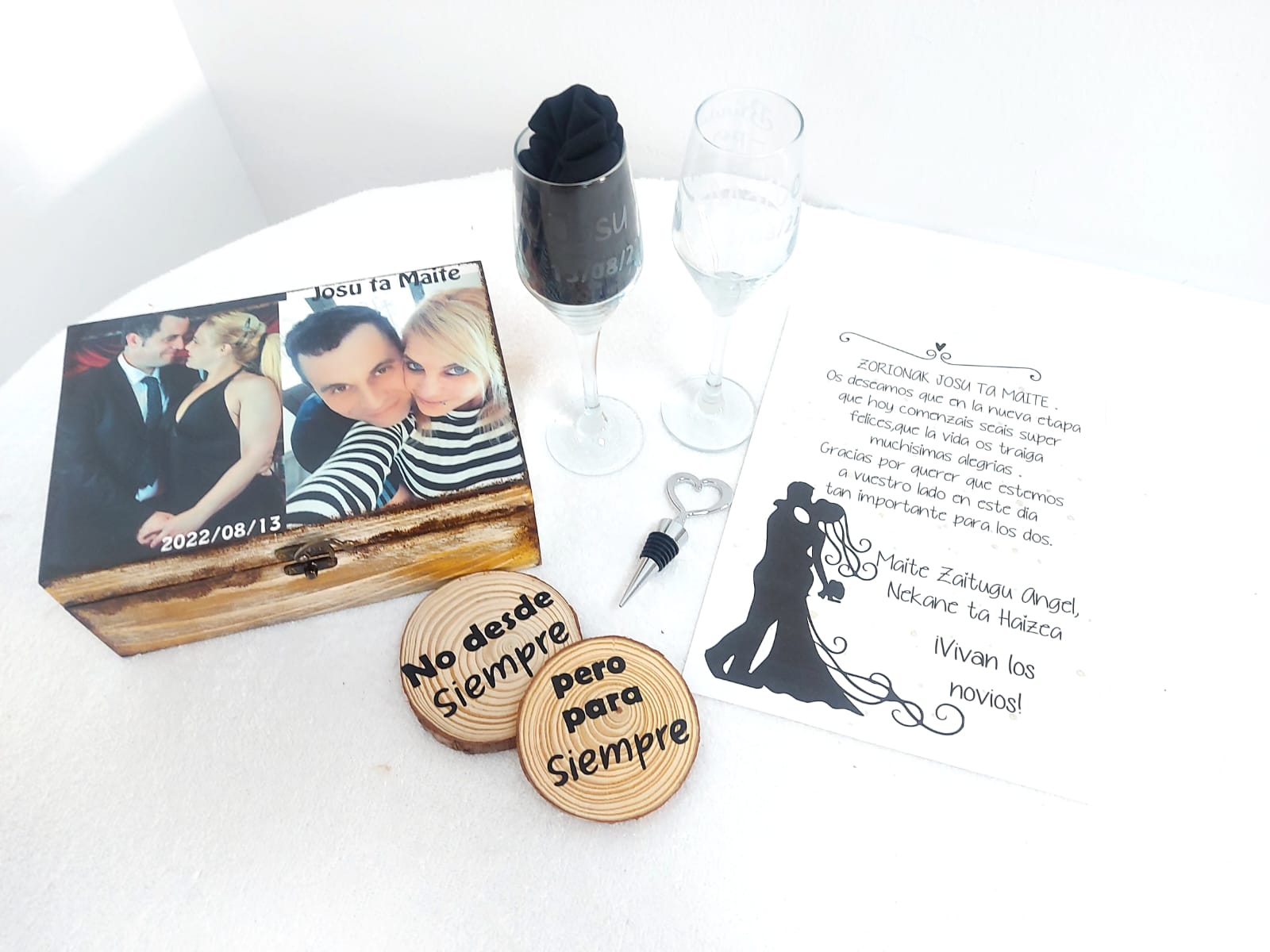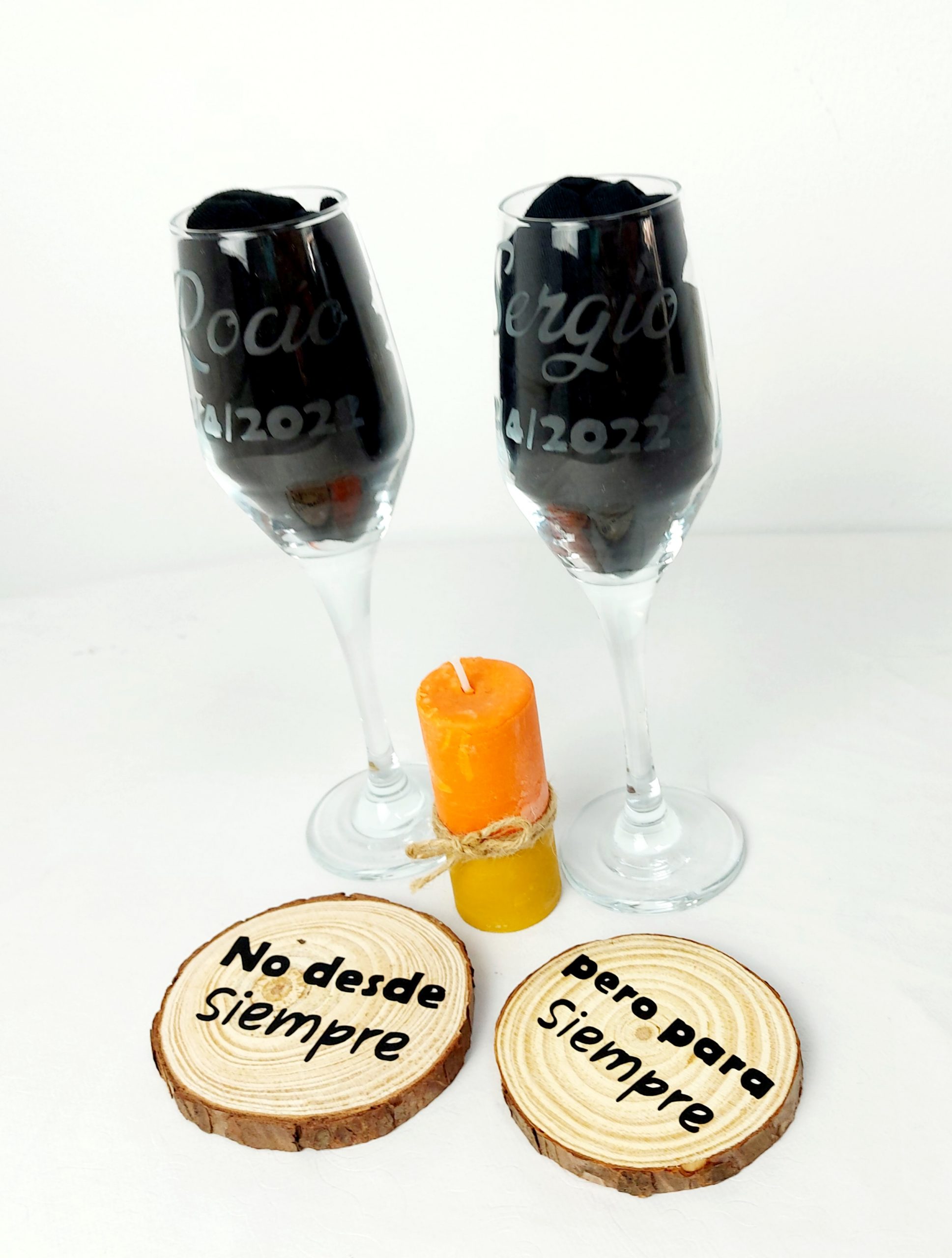 • 2 copas de cava grabadas (grabadas con nombre y fecha de la boda)