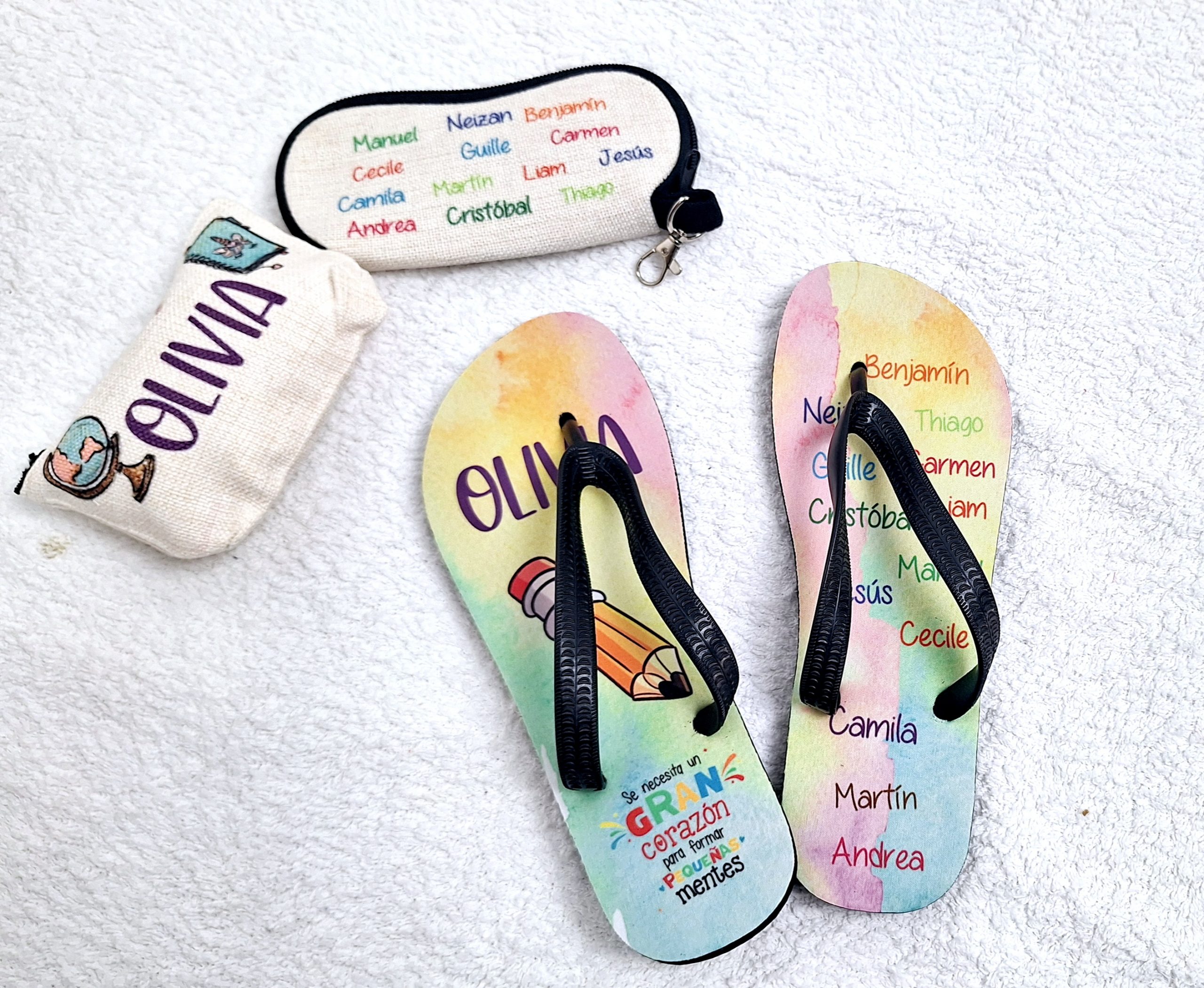 Pack chanclas, porta gafas de lino y neceser de lino.