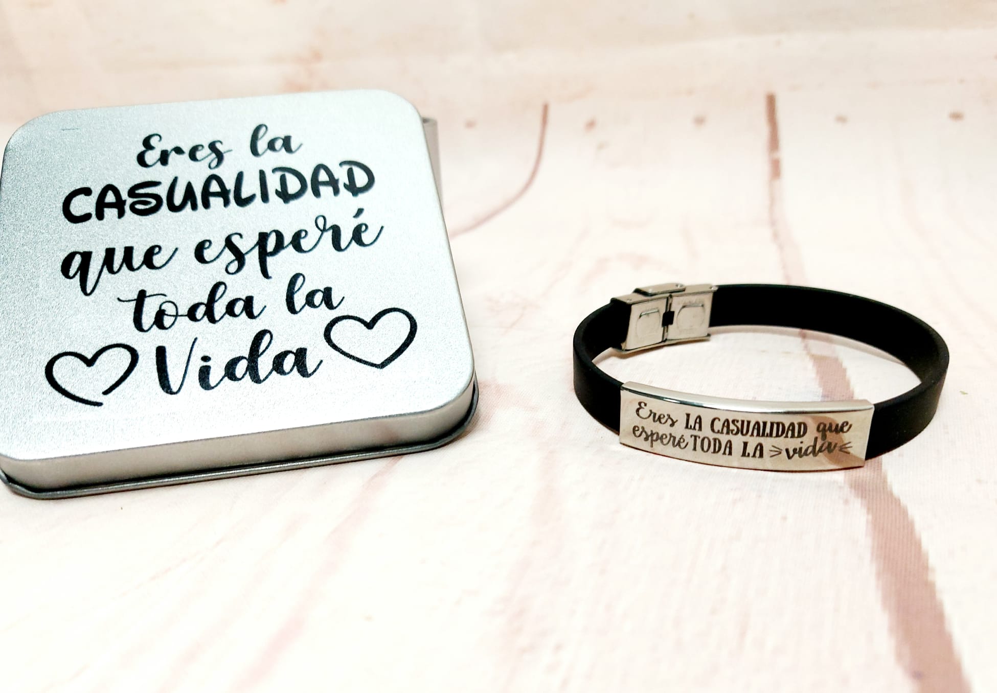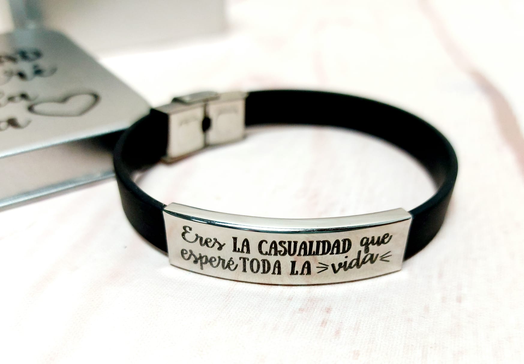 Pulsera acero inoxidable y caucho. Color negro.  Eres la casualidad que espere toda la vida.