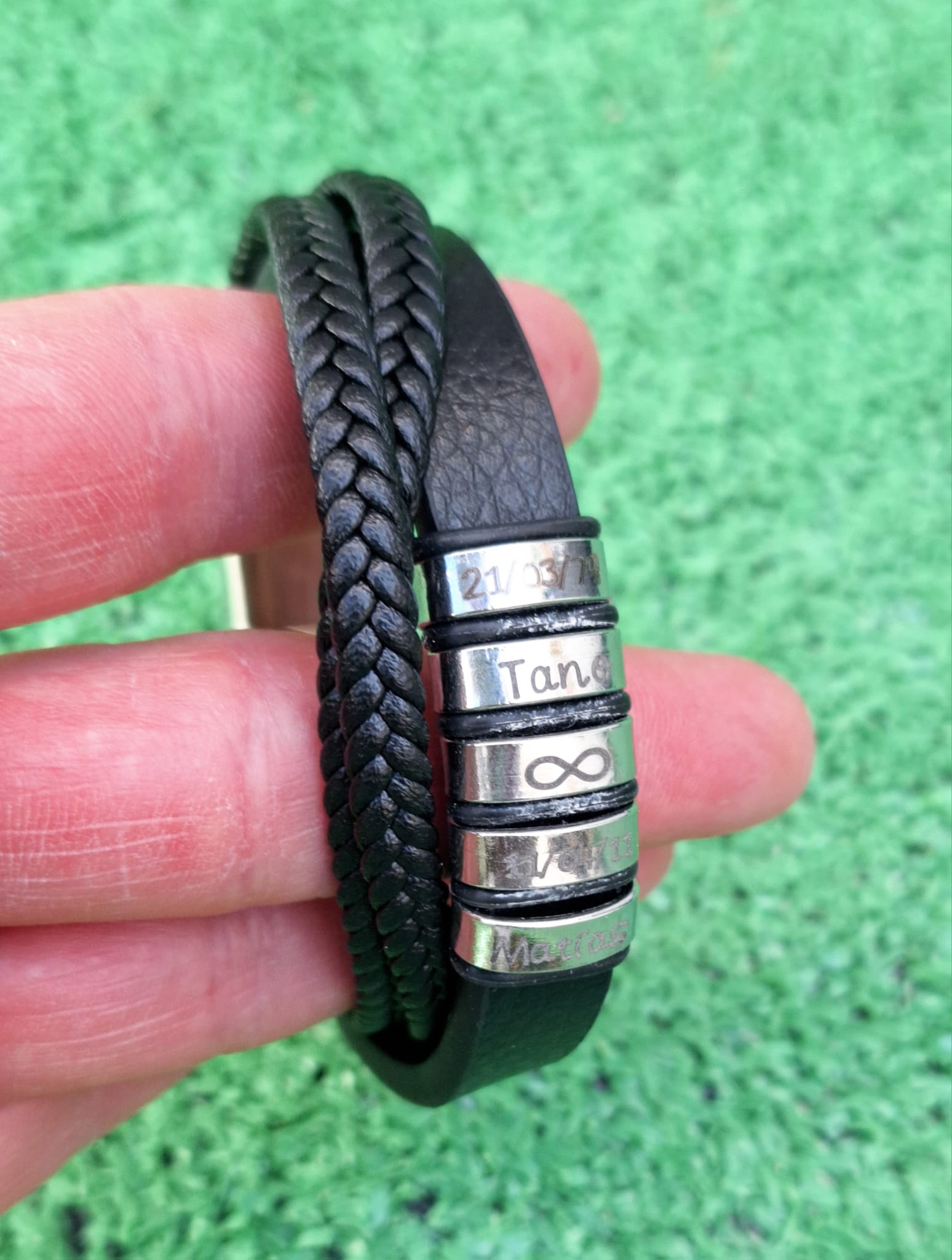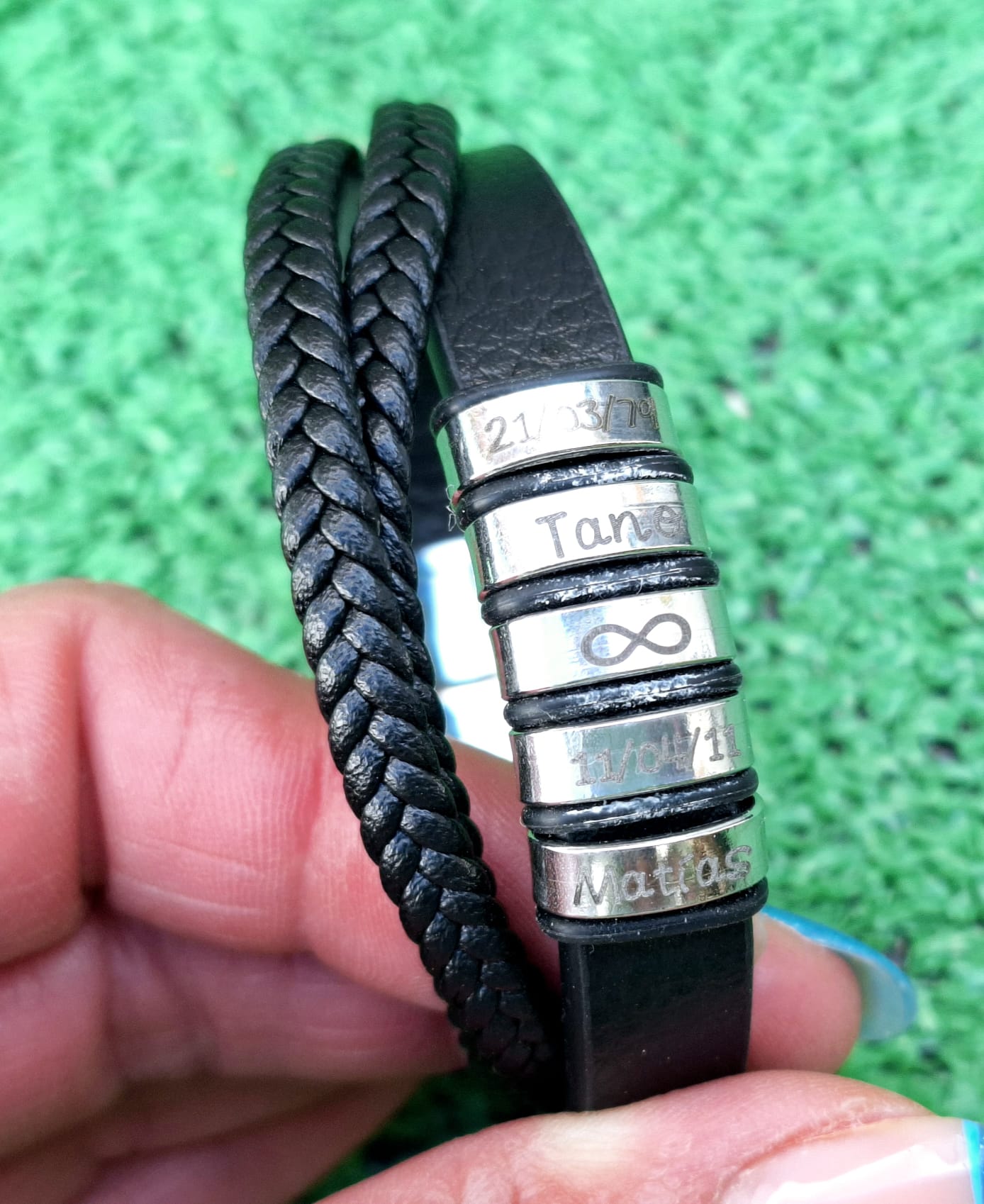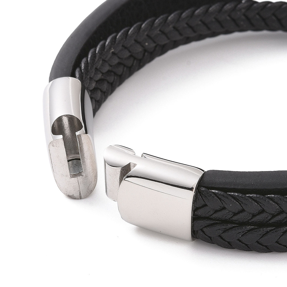 Pulsera hombre cuero negro doble tira con 5 pasadores de acero 22 cm