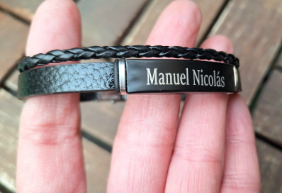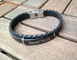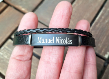 Pulsera hombre cuero negro doble tira y placa acero negro 23 cm.