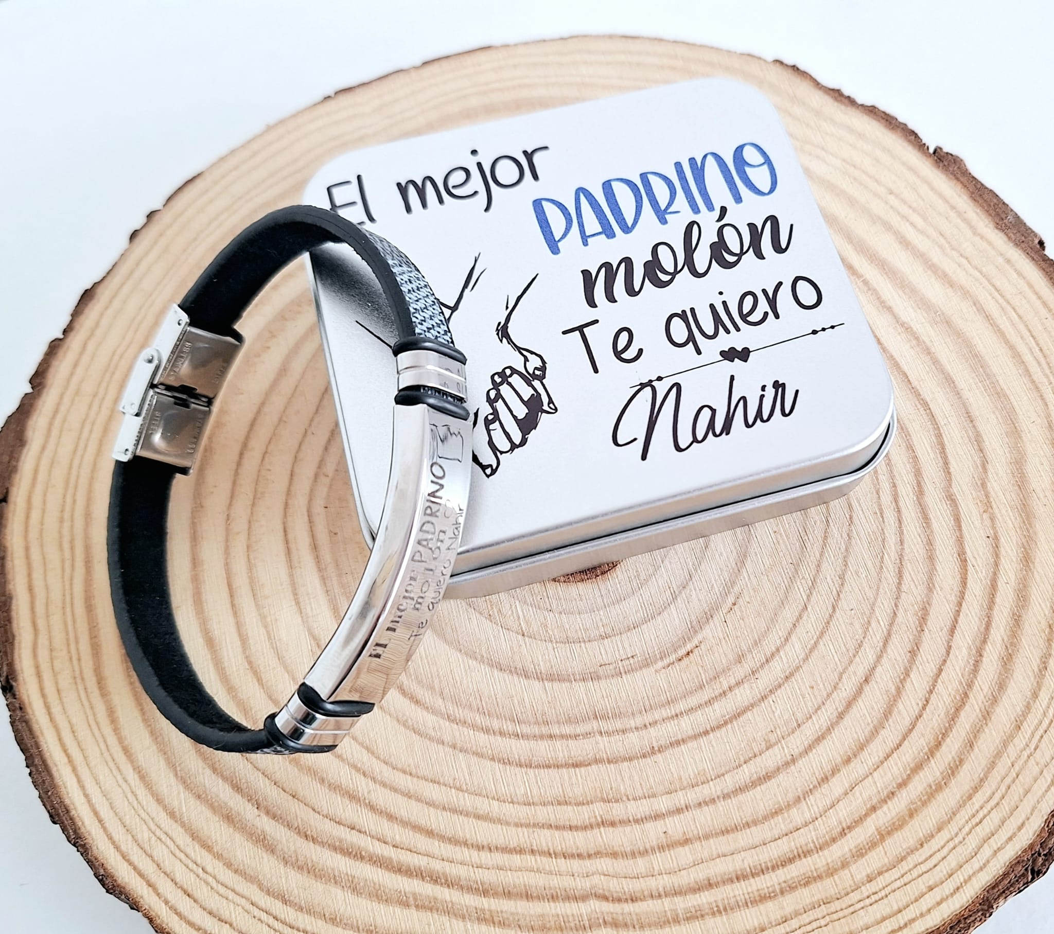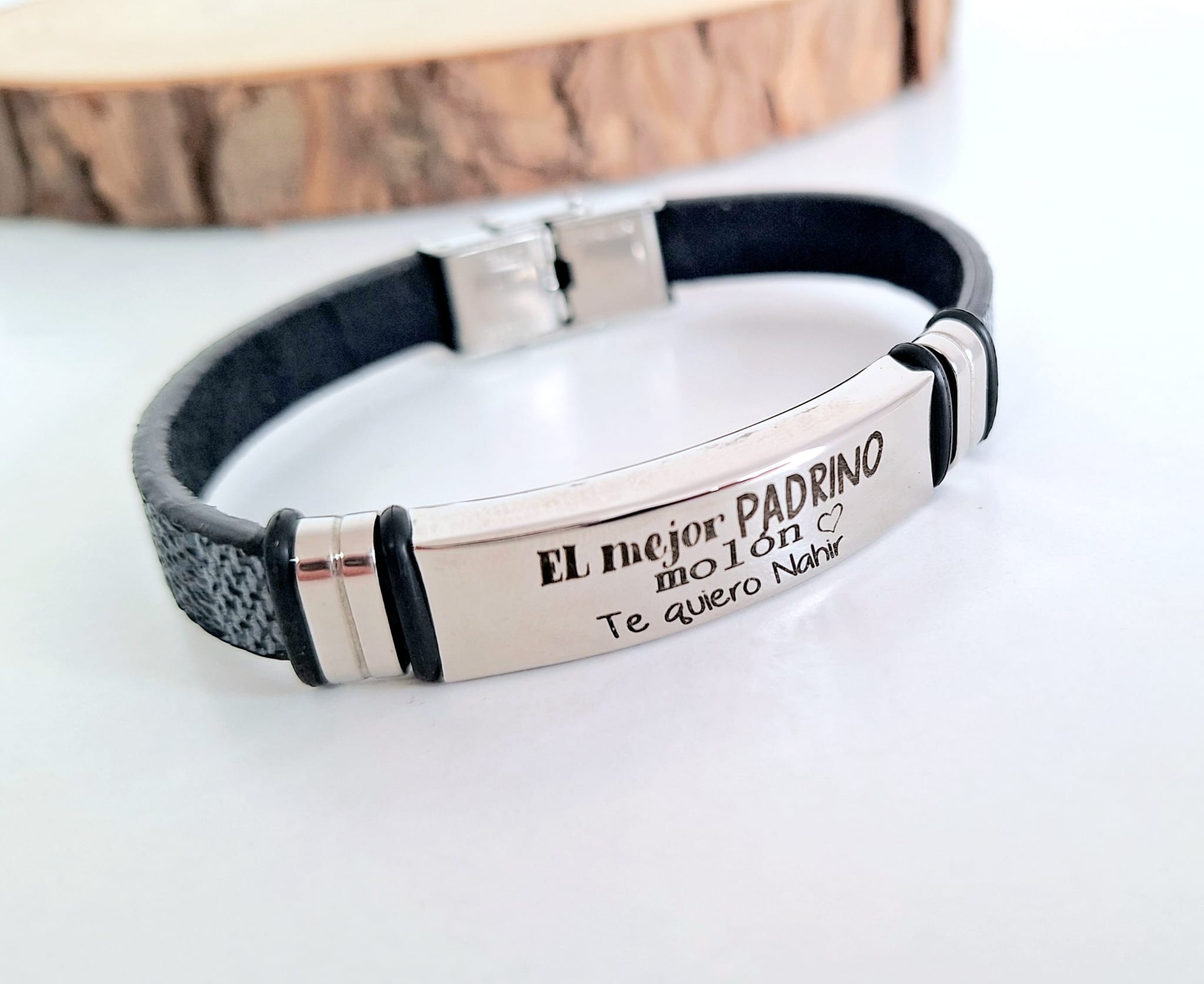 Pulsera hombre cuero negro y azul textura 10 mm y placa acero ( grabar) 23 cm