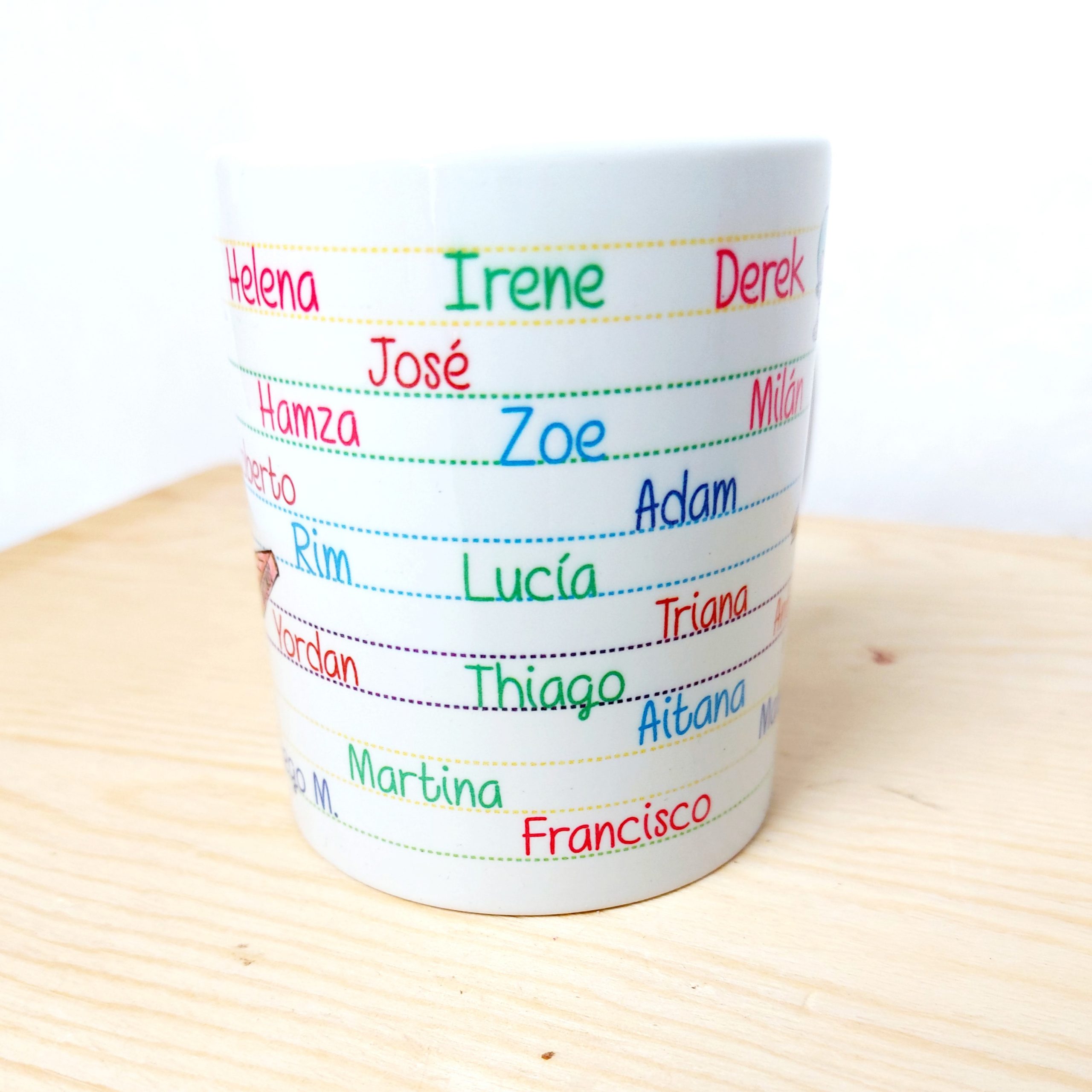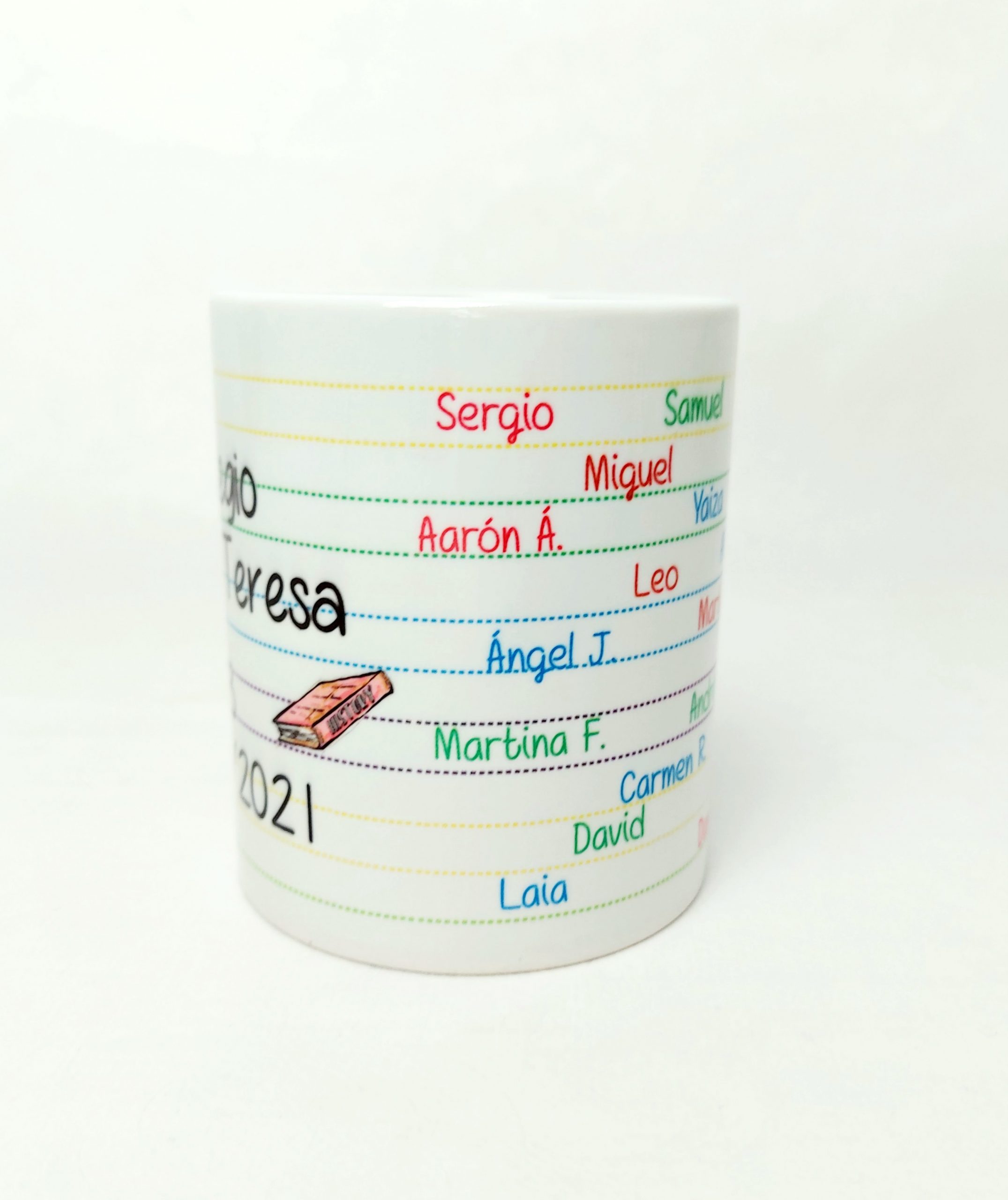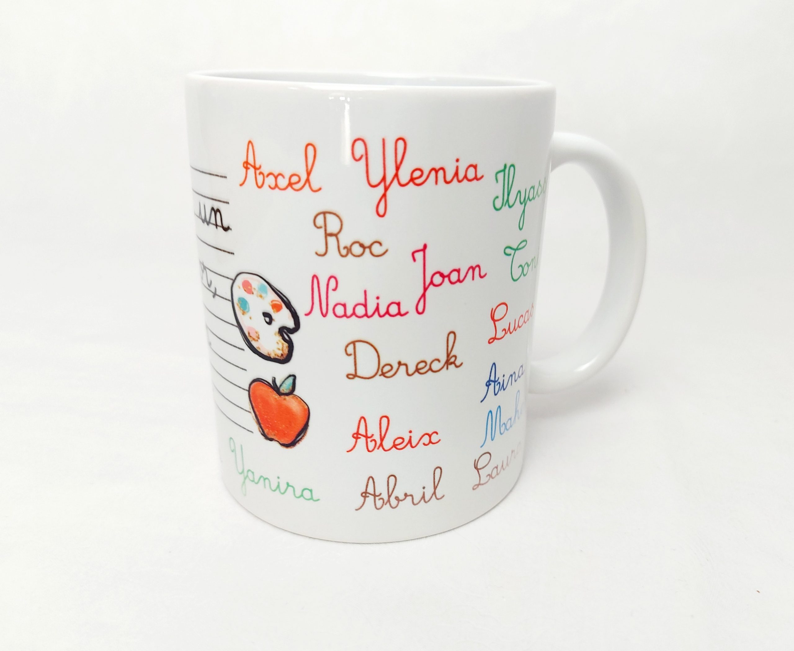 Tazas personalizadas con el nombre de los alumnos, curso, nombre de la seño. etc..